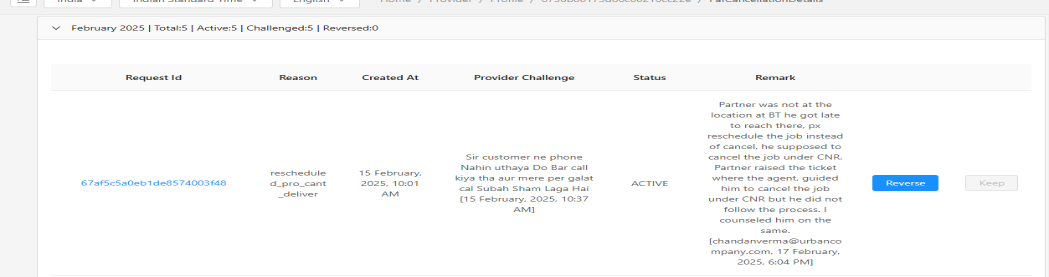 | Note - If cancellation is challenged and PAF is rejected by trainer ( can be seen by using following steps - Open partner profile > Logs > Provider at Fault Cancellations > Request level view ) then we have to counsel partner on that reason as mentioned by trainer and close the ticket. | |||||||||||