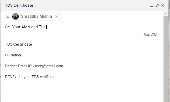 Scenario: If the partner has reached out for the TDS cert and if it is not uploaded on the drive then we will follow Step2