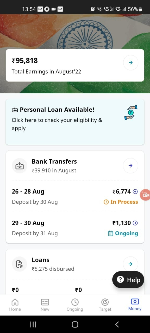 Partner can apply for Personal Loan from App itself, which will be visible in Money Section of the App as shown below